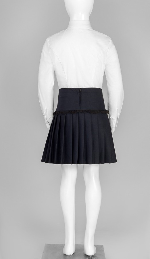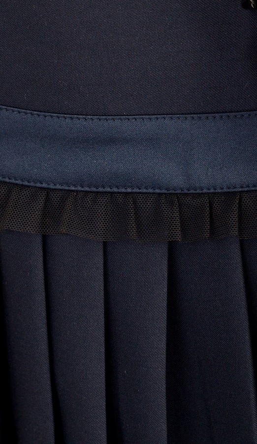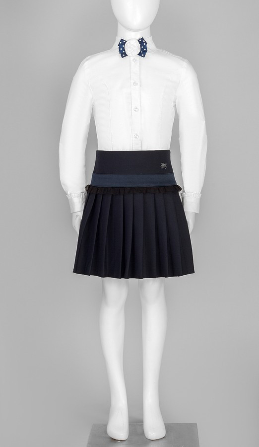 Чарівна спідниця з декоративним поясом - чудовий варіант для щоденного шкільного гардеробу. Верх спідниці оформлений широкою кокеткою, оригінально доповненою декоративною планкою з милою рюшею. Щоб модель ідеально лягала по талії, з внутрішньої сторони з боків спеціально вшита резинка з ґудзиками, для регуляції. На задній частині виробу по центру кокетки розташована зручна застібка- "блискавка". Кокетливих ноток спідниці надає плісирований низ.