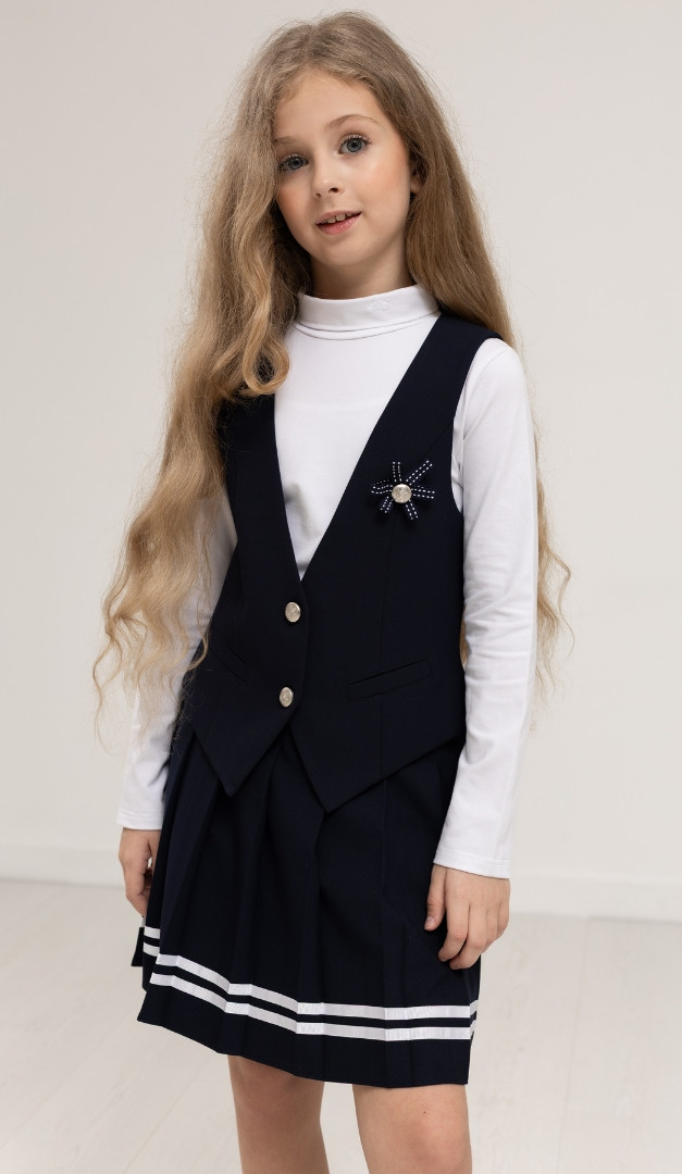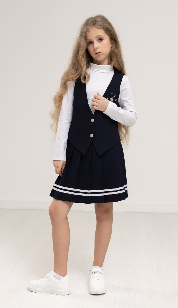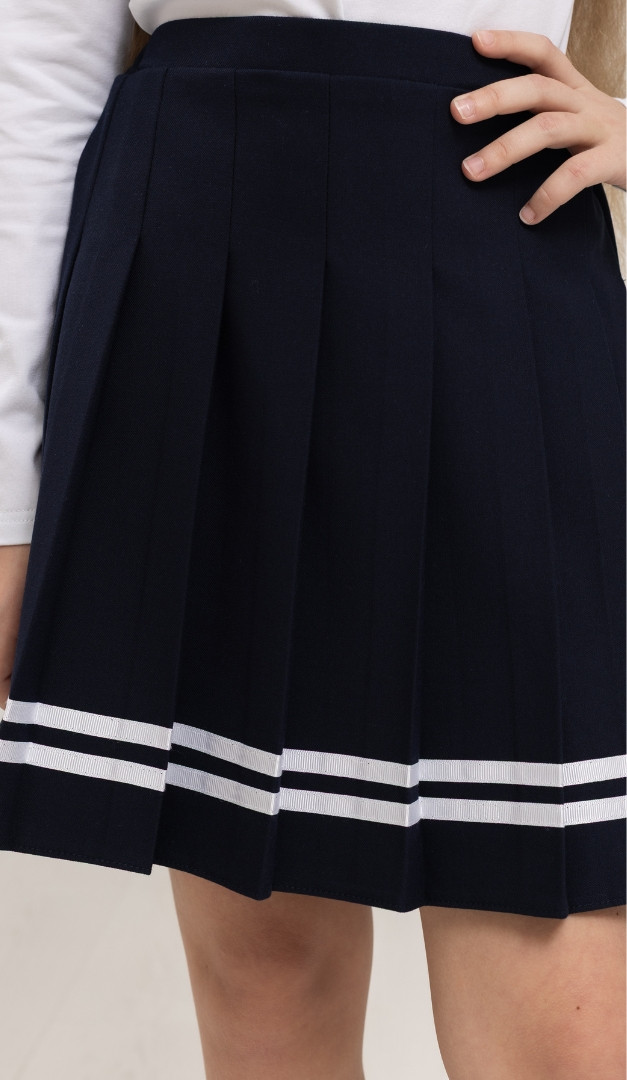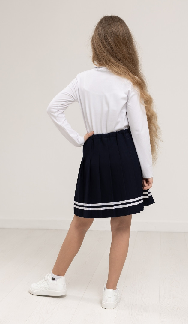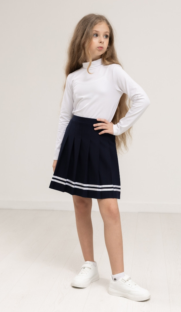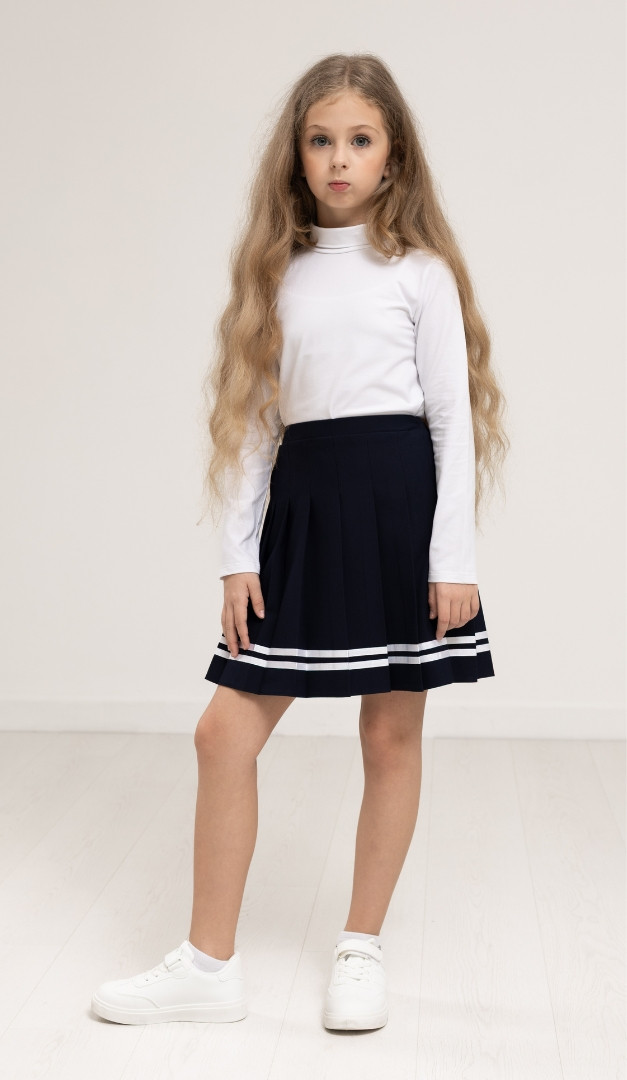 Спідниця для дівчинки синя з тасьмою, безумовно, стане одним із улюблених елементів в шкільному гардеробі вашої модниці! Модель має середню посадку, верх оформлений вузьким поясом. Грайливості спідниці надають складки, що розташовані по всьому виробу і контрастна тасьма по низу. Ззаду по лінії талії спідниця для дівчинки синя з тасьмою фіксується за рахунок внутрішньої еластичної резинки. Залежно від розміру талії дитини, обхват спідниці може регулюватися за допомогою розташованої усередині резинки і ґудзиків. Без додаткових застібок. На підкладці.