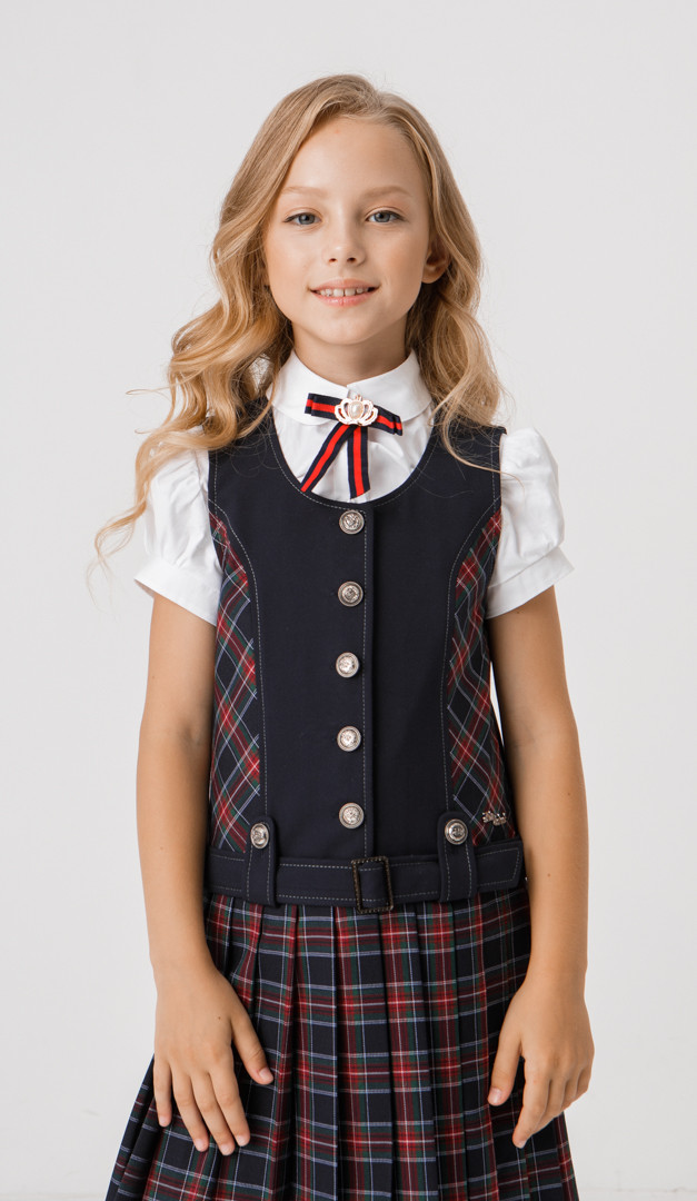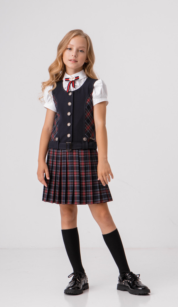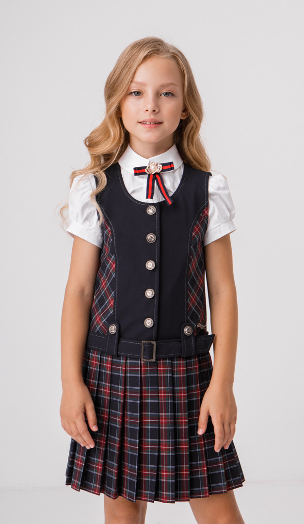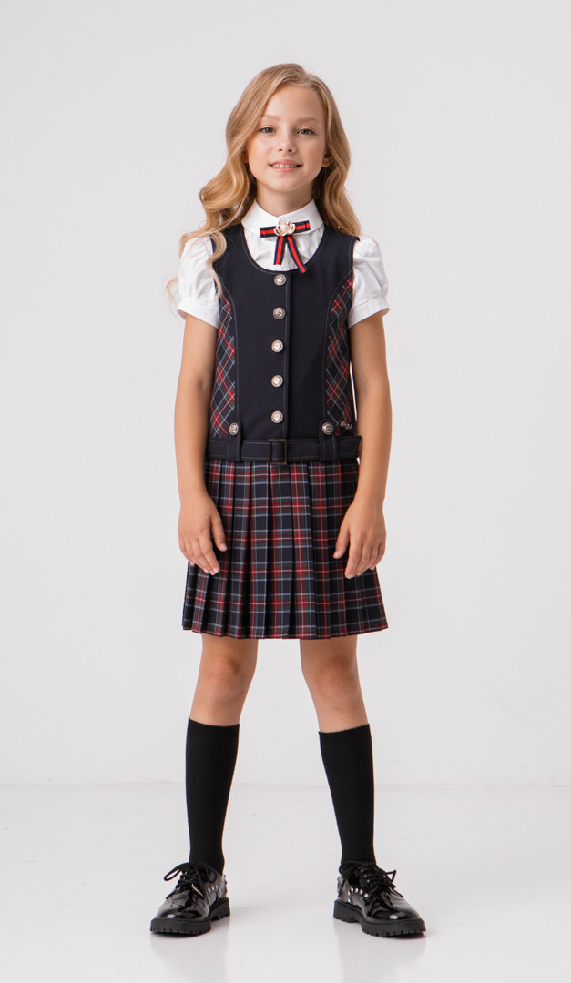 Класичний сарафан для дівчаток шкільного віку. Поличка оформлена акуратним округлим вирізом, фігурними рельєфами і дуже зручною застібкою на ґудзики по центру. Злегка занижена лінія талії підкреслена поясом з пряжкою, протягнутим в оригінальні петлі на ґудзиках. Спинка оформлена фігурними рельєфами. Миловидності сарафану Мирося надає низ, оформлений дрібними симпатичними складками "плісе". Без підкладки.
