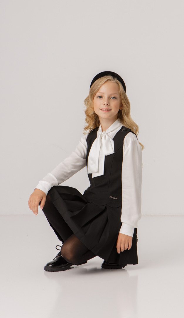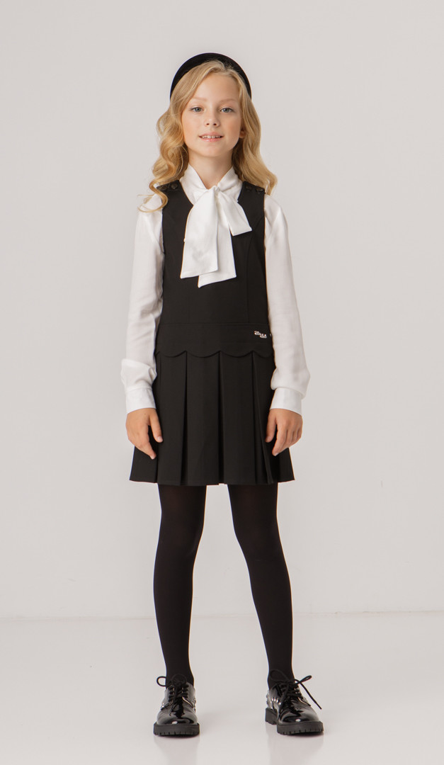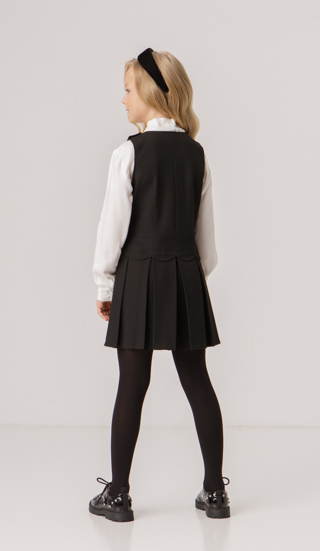 Сарафан з фігурним оздобленням сподобається Вам своїм кокетливим дизайном і практичністю. Модель на бретелях що застібаються, які можна зробити коротше за рахунок ґудзиків. Це дуже зручно для регуляції довжини в залежності від росту дитини. Гарному приляганню по поличці і спинці сприяють фігурні рельєфи. Головна "родзинка" сарафана — це занижена лінія талії, оригінально доповнена фігурним поясом-кокеткою. У бічному шві знаходяться потаємна застібка- "блискавка". Також сарафан має злегка розкльошений низ в зустрічну складку. Без підкладки.
