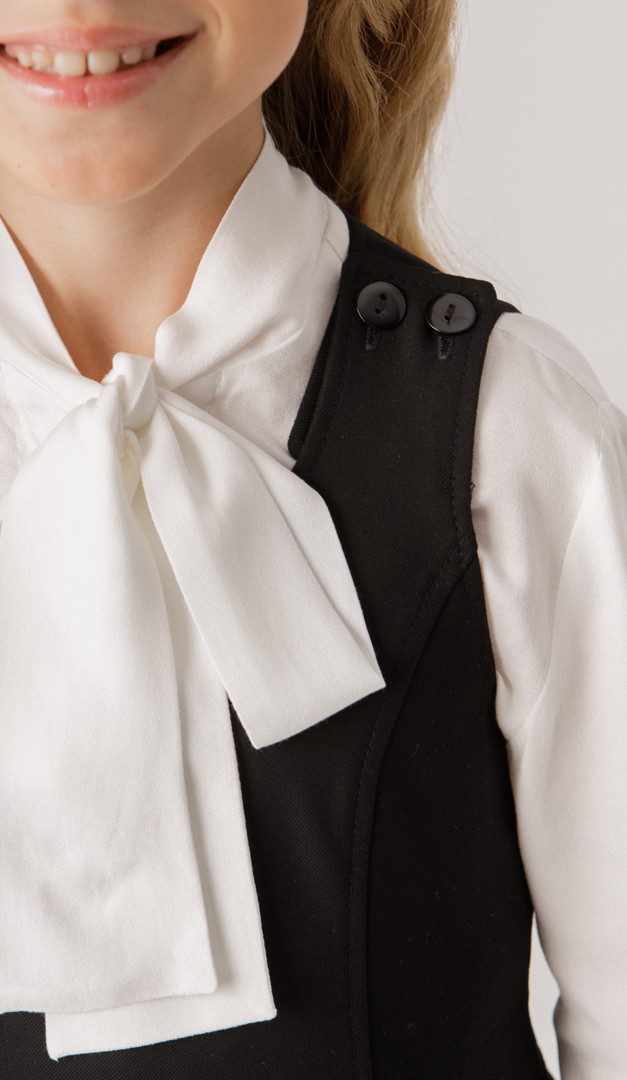 На фото створений образ із блузкою з коміром-бантом (арт.970) та білою блузкою (арт.976).
