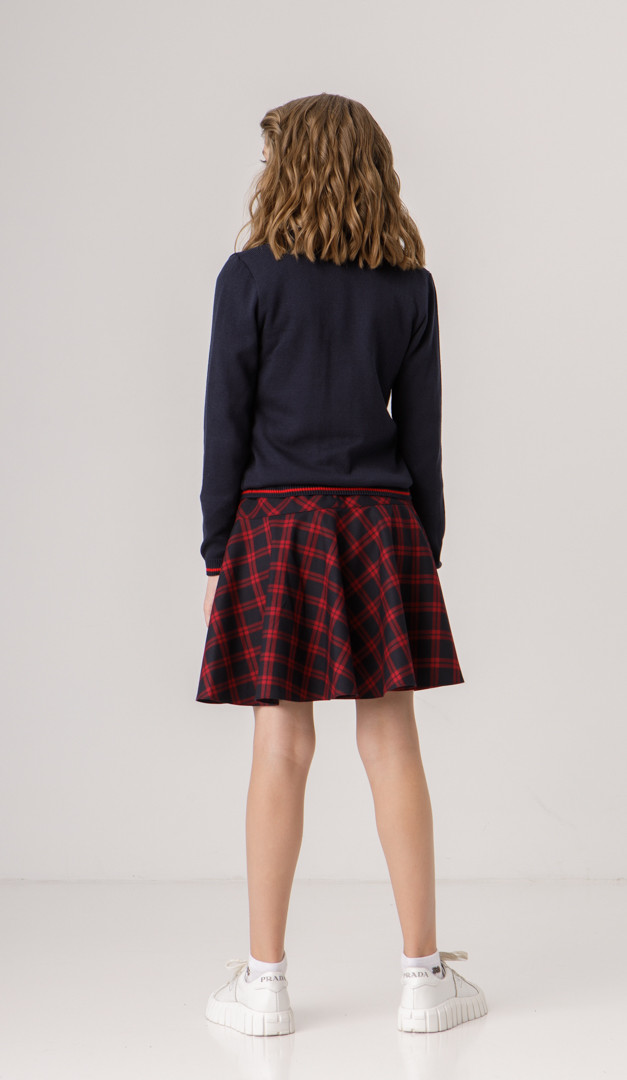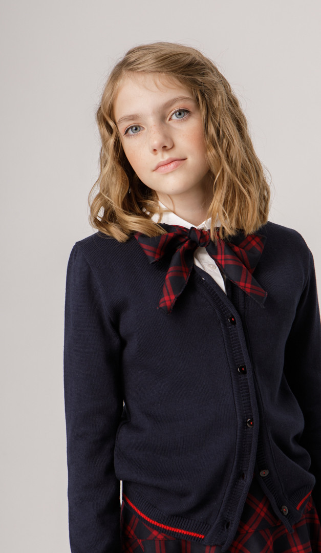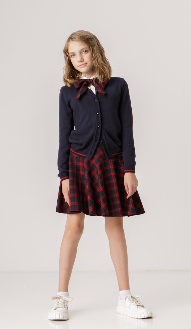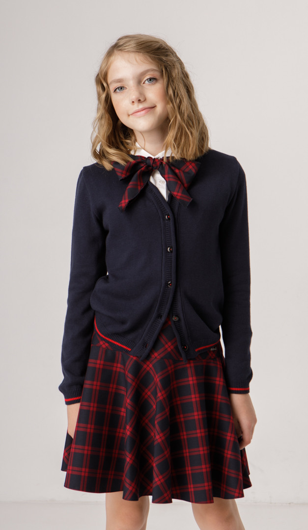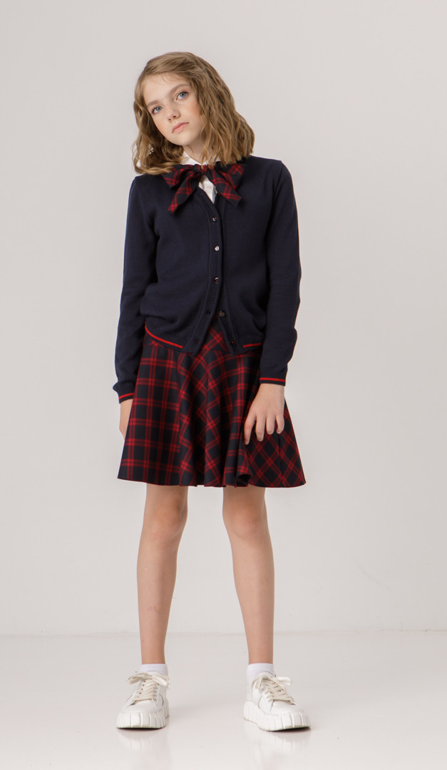 Трикотажна кофта для дівчинки синя з червоним кантом стане елегантним доповненням будь-якого повсякденного образу дівчинки. Модель має прямий прилеглий крій із застібкою на ґудзики. Кофта буде гармонійно поєднуватися з будь-якою блузою і гольфом завдяки зручному V-подібному вирізу горловини.
