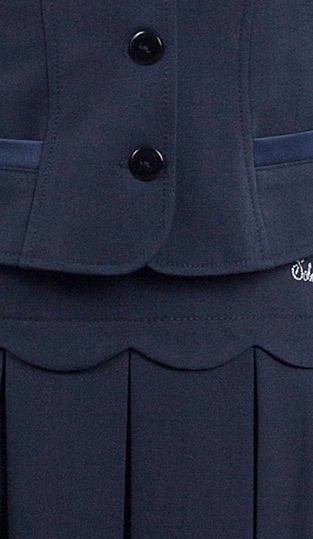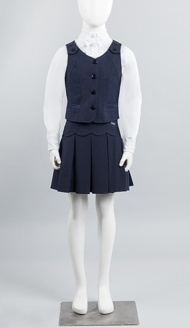 Жилет для дівчаток, на бретелях і з ґудзиками. Виріз горловини неглибокий і злегка V-подібної форми. Виріб на бретелях, що фіксуються на два ґудзики, що дуже зручно для регуляції довжини в залежності від росту дитини. Також поличка прикрашена фігурними діагональними і прямими рельєфами, що сприяють зручному приляганню по фігурі. Виріб застібається по центру полички на ґудзики. Жилет оригінально доповнений невеликими накладними функціональними кишенями з контрастною планкою. На спинці зверху знаходиться невелика кокетка, рельєфи і хлястик на еластичній резинці по лінії талії. Модель на підкладці.