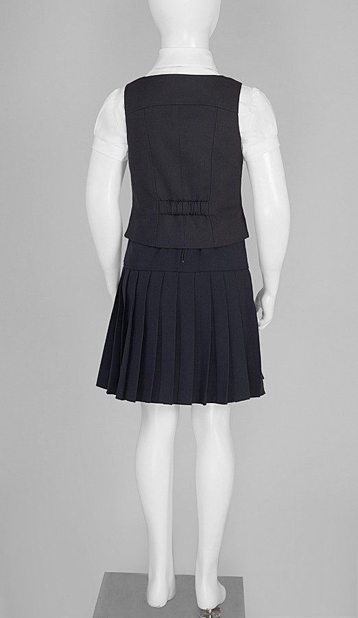 Симпатична і зручна жилетка для дівчаток на підкладці. Виріз горловини неглибокий і злегка V-подібний. Виріб на бретелях, що фіксуються на два ґудзики, що дуже зручно для регуляції довжини в залежності від росту дитини. Також поличка прикрашена фігурними рельєфами і невеликими накладними функціональними кишенями. На спинці зверху знаходиться невелика кокетка, рельєфи і хлястик на резинці по лінії талії. Виріб застібається по центру полички на ґудзики.