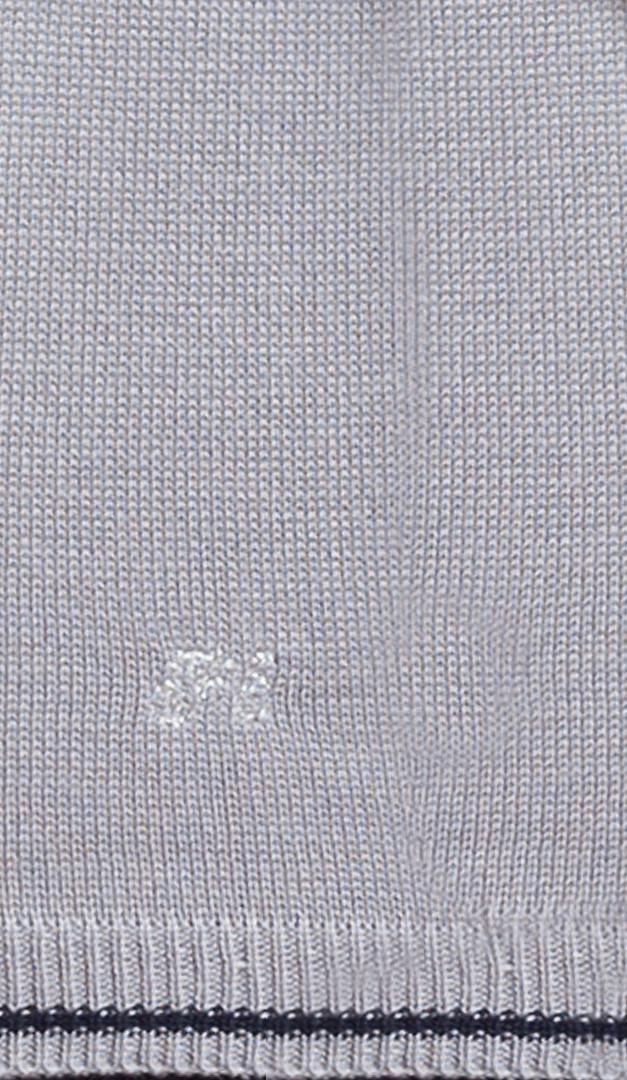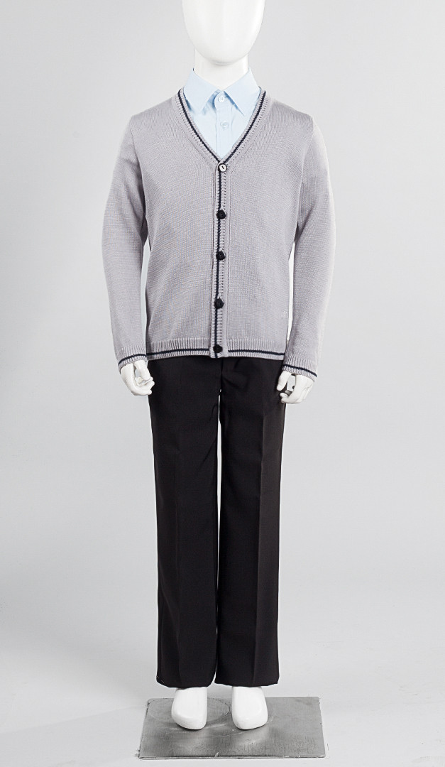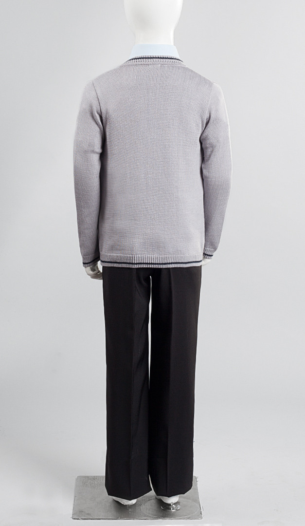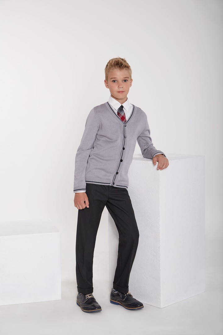 Стильна трикотажна кофта сіра з синім кантом для хлопчиків шкільного віку. Модель виконана з V-подібним вирізом горловини, що плавно переходить в еластичну планку-застібку на ґудзики і довгим рукавом. Низ моделі і неширокі манжети рукавів виробу оформлені м'якими планками-резинками з контрастною лінією. Завдяки своїй універсальності і практичності трикотажна кофта стане вдалим доповненням шкільного та повсякденного гардеробу хлопчика.