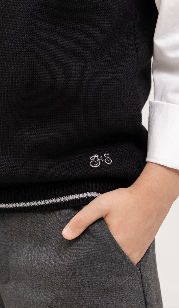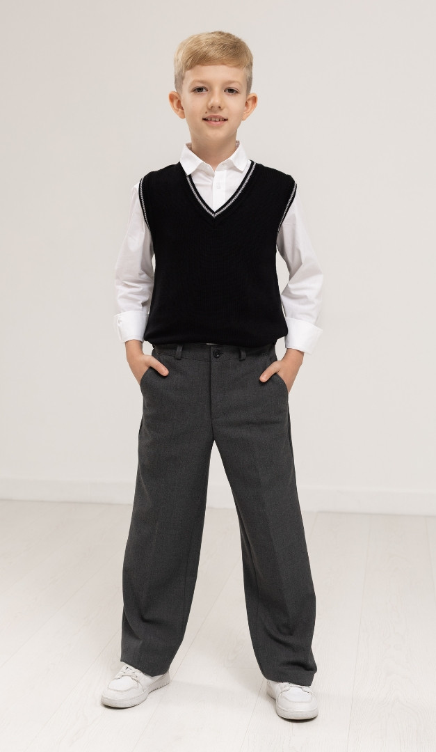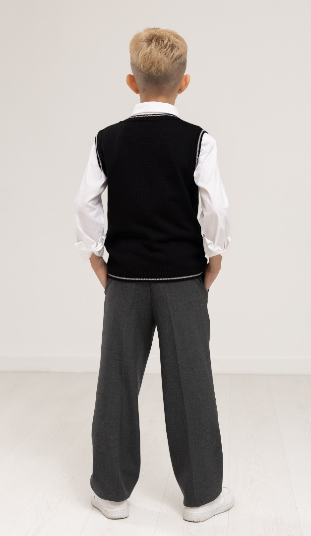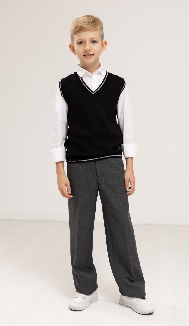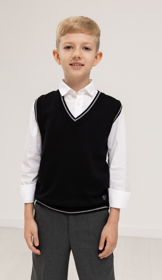 Трикотажний жилет чорний з сірим кантом — відмінна базова річ для повсякденного гардероба школяра. Модель напівприталеного силуету, з неглибоким і зручним V-подібним вирізом горловини. М'які еластичні планки-резинки, якими оформлено виріб, мають контрастну лінію. Завдяки цим планкам модель тримає свою форму і відмінно сідає по фігурі дитини.