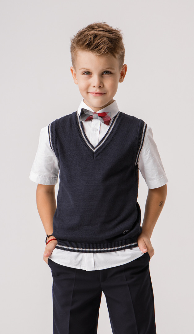 Трикотажний жилет синій з сірим кантом — відмінна базова річ для повсякденного гардероба школяра. Модель напівприталеного силуету, з неглибоким і зручним V-подібним вирізом горловини. М'які еластичні планки-резинки, якими оформлено виріб, мають контрастну лінію. Завдяки цим планкам модель тримає свою форму і відмінно сідає по фігурі дитини.