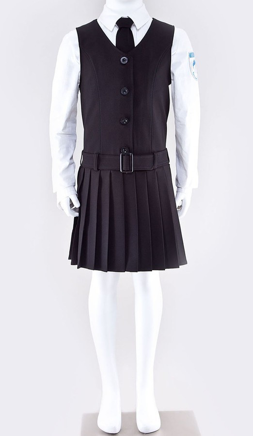 Миловидний комплект-трійка для дівчаток шкільного віку. Жакет комплекту напівприталеного силуету на нейлоновій підкладці. Поличка прикрашена фігурним відкладним коміром, фігурними кокетками, підрізами і накладними кишенями, прикрашеними ґудзиками. Рукав з імітованим манжетом з ґудзиком і додатковим запасом тканини по низу. Спинка жакета прикрашена поздовжніми рельєфами і декоративним хлястиком з ґудзиками.
