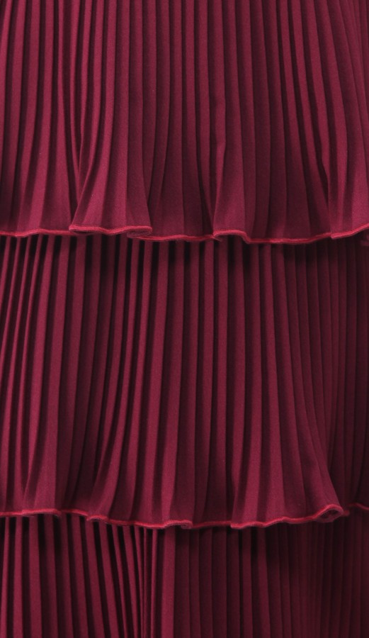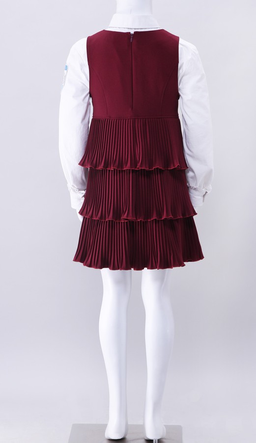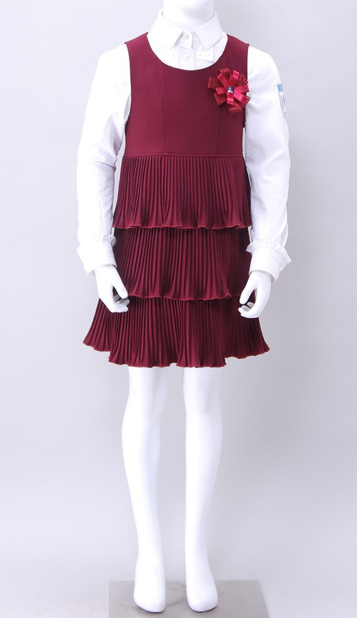 Ошатний сарафан із завищеною лінією талії для дівчаток шкільного віку. Поличка оформлена неглибоким округлим вирізом горловини, двома прямими рельєфами, а також елегантно прикрашена декоративною брошкою-квіткою. Додаткової святковості сарафану надають три ряди кокетливо гофрованих рюш. Спинка оформлена двома рельєфами і має застібку на потаємну блискавку, розташовану в середньому шві.